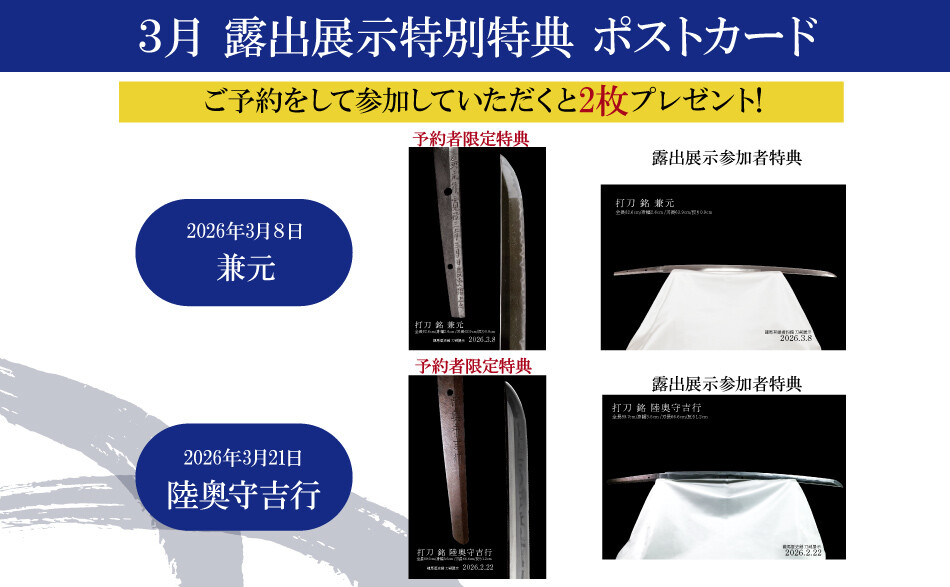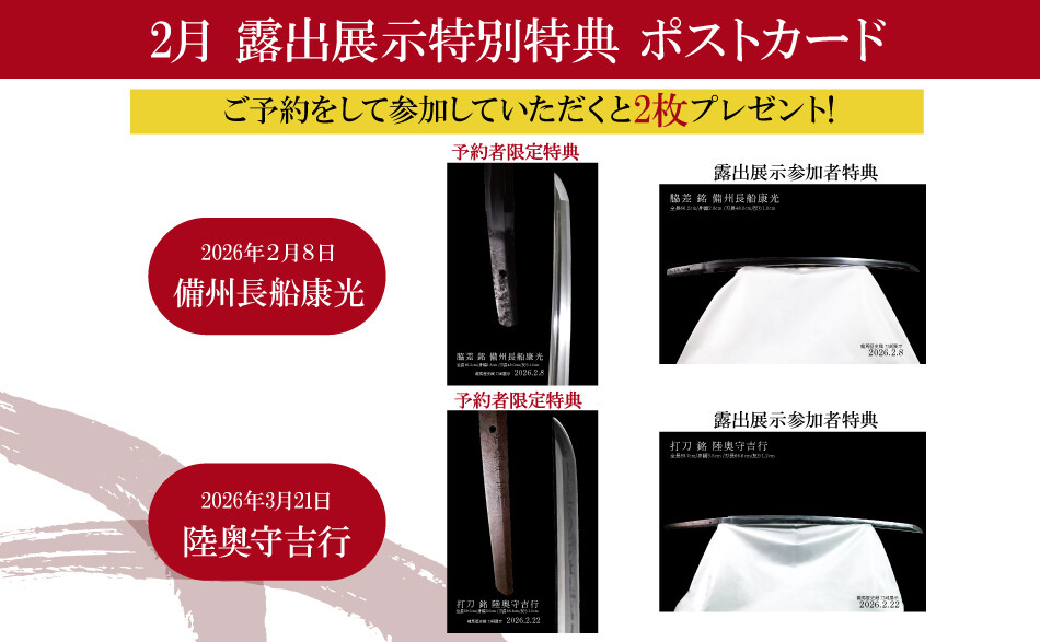 予約特典・参加者特典を2月より配布いたします。露出展示をご予約、または当日ご参加して頂いた方にのみ、その日展示した刀剣のポストカードを配布いたします。