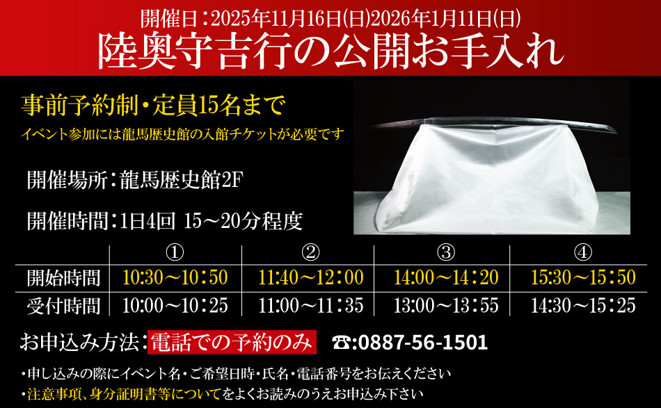 陸奥守吉行の公開お手入れ 龍馬歴史館の入館チケットでご参加いただけます。