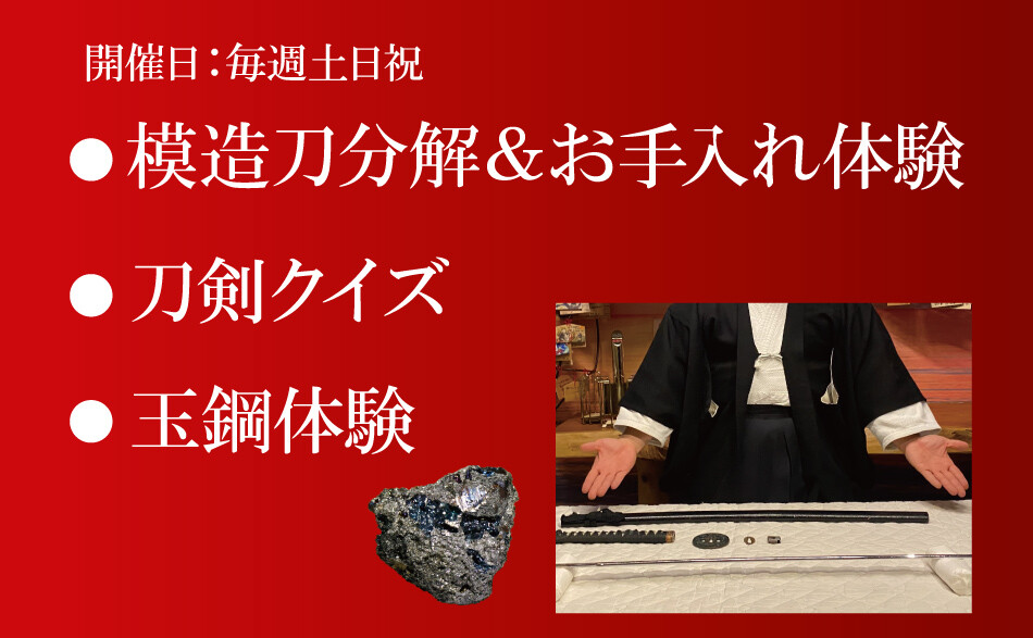 模造刀の分解組み立て、お手入れができる体験や刀剣の作刀に使われる貴重な玉鋼に触れる体験、刀のクイズを開催します。