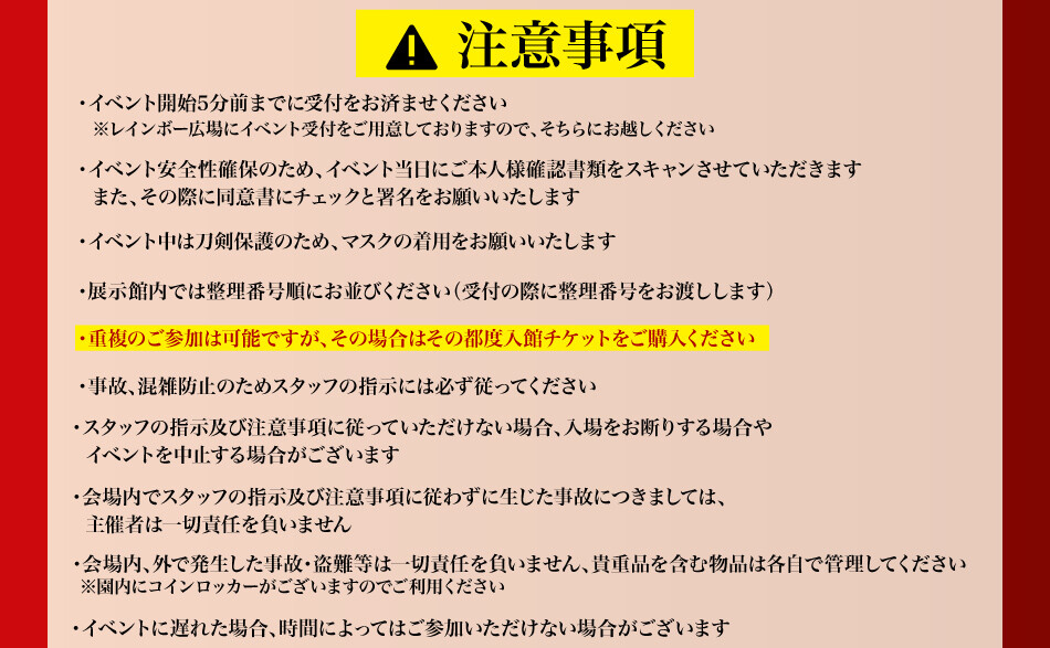 イベント申し込みをされる際は下記の注意事項、身分証明書等についてをよくお読みになってからお申し込みください。