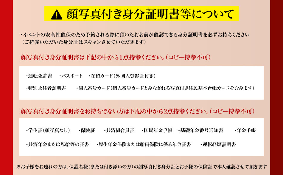 お申込みが必要なイベントにつきましてはイベント当日に安全性確保のため身分証明書のご提示が必須となっております。