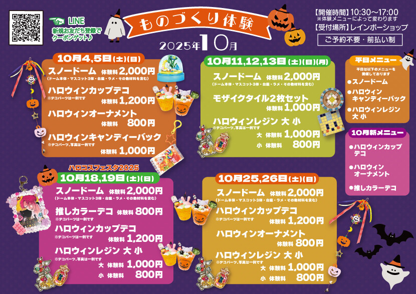 10月はスノードーム・ハロウィンキャンディーバック・ハロウィンレジン大・小からいずれかのメニューが開催されます。