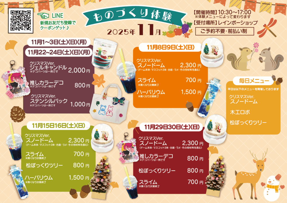11月はスノードーム・木工ロボ・松ぼっくりツリーからいずれかのメニューが開催されます。