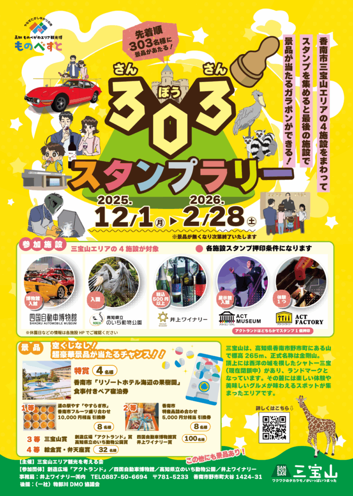 三宝山エリアの【四国自動車博物館】【高知県立のいち動物公園】【井上ワイナリー】【創造広場「アクトランド」(アクトミュージアムorアクトファクトリー】をまわってスタンプを集めると最後にスタンプを押した施設でそのまま景品が当たるガラポンに挑戦できます!(※景品がなくなり次第終了いたします)