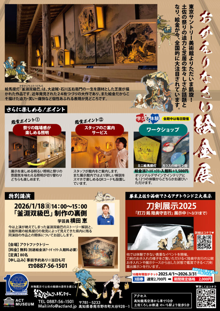 アクトミュージアム 絵金派アートギャラリー内では、『おかえりなさい絵金展』を開催。9月より東京のサントリー美術館で開催された『幕末土佐の天才絵師 絵金』に貸し出していた絵馬提灯25枚(うち1枚欠失で現在は24枚)の大作を展示いたします。