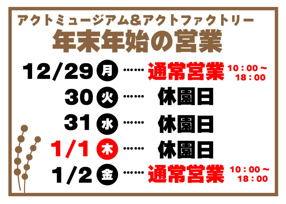 2025年12月27日年末年始の営業のお知らせ 創造広場「アクトランド」の年末年始の営業は下記の通りです。 12/29(月)通常営業(10:00~18:00) 12/30(火)休園日 12/31(水)休園日 1/1(木)休園日 1/2(金)通常営業 (10:00~18:00)