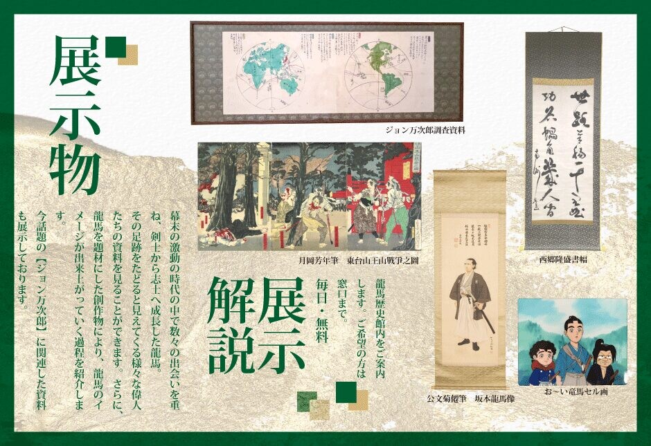 龍馬を題材にした創作物により、龍馬のイメージが出来上がっていく過程を紹介します。 今話題の【ジョン万次郎】に関連した資料も展示しております。